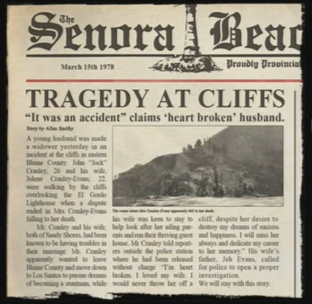 Если посетить гору Гордо в промежуток между 23:00 и 00:00 по игровому времени, то можно увидеть призрак женщины весьма стрёмной наружности. Если подойти достаточно близко, она исчезнет, оставив лишь написанное кровью Jоck. В 1978 году Джока Кренли заподозрили в убийстве своей жены, Джолин Кренли Эванс, — он столкнул её со скалы во время ночной прогулки. Доказательств его причастности к этому инциденту так и не нашли, однако привидение несчастной всё ещё появляется на месте происшествия.