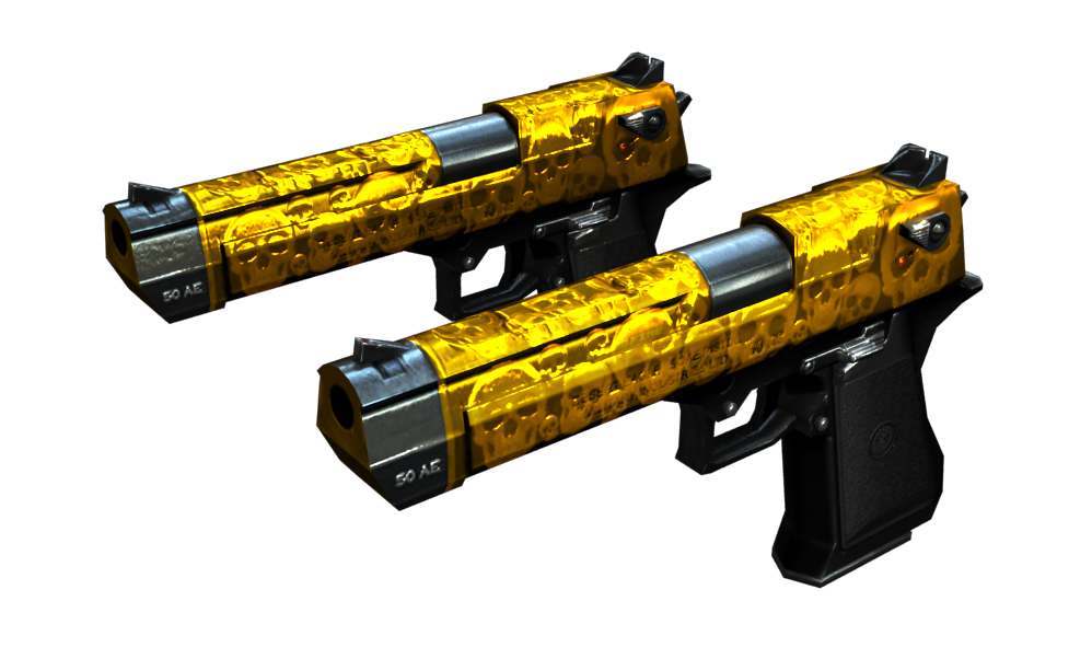 Два пистолета Desert Eagle, украшенные изображениями золотых черепов.