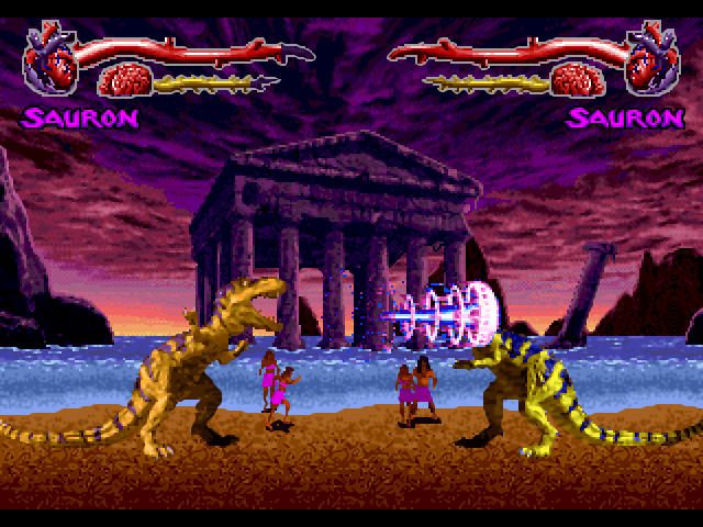 Одна из очень старых игр про борцовскую жизнь динозавров и других доисторических животных тоже заслужила место в этом списке. Особенность полосок жизней здесь в том, что к ним подошли с большой креативностью (а ведь сейчас креативность на последнем месте, в моде минимализм). Полоска — это как бы артерия сражающегося динозаврика, и кровь из нее потихоньку приближается к сердцу. В последний момент орган «разрывается» и «боец» умирает, а у играющих в этот файтинг появляется ужасное желание попробовать еще раз. Креативность, да-да.