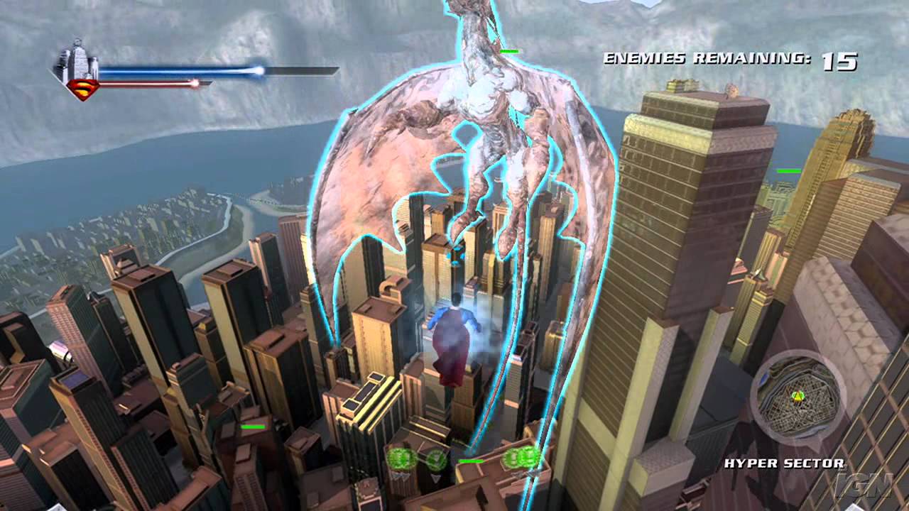 В свое время лицензию на создание игр по фильму получил не тот разработчик. Игры были ужасными, все до единой. Супермен всегда получал ту самую часть говна, которую по факту должны были получать другие, менее популярные на то время персонажи. Создавая Superman Returns, EA наконец вспомнили, что Супермен, сука, неуязвим. И никаких полосок жизней ему не нужно! Наконец-то одумавшись, разработчики сделали хелсбар для города, который Супермен курирует! И это уже имеет смысл, ведь как только город будет уничтожен или порабощен, то Кларк Кент «погибнет». Полетит на свой Криптон самолично. Ну и полоска, в целом, красивая.